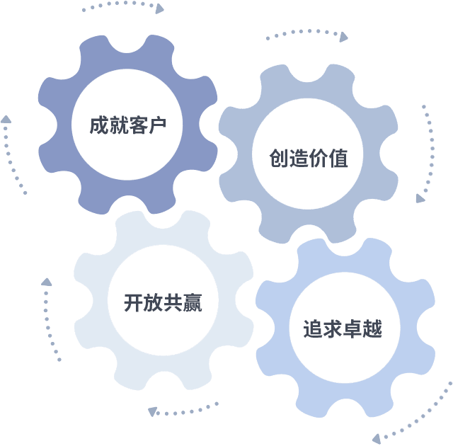 成就客户是一切决策的出发点,,创造价值是衡量所有工作的标准,,,,追求卓越是我们做事做人的态度,,,,开放共赢是我们的格局也是最终的结果。。。。价值观的齿轮环环相扣,,,推动着组织里的每个人不断向前。。。。