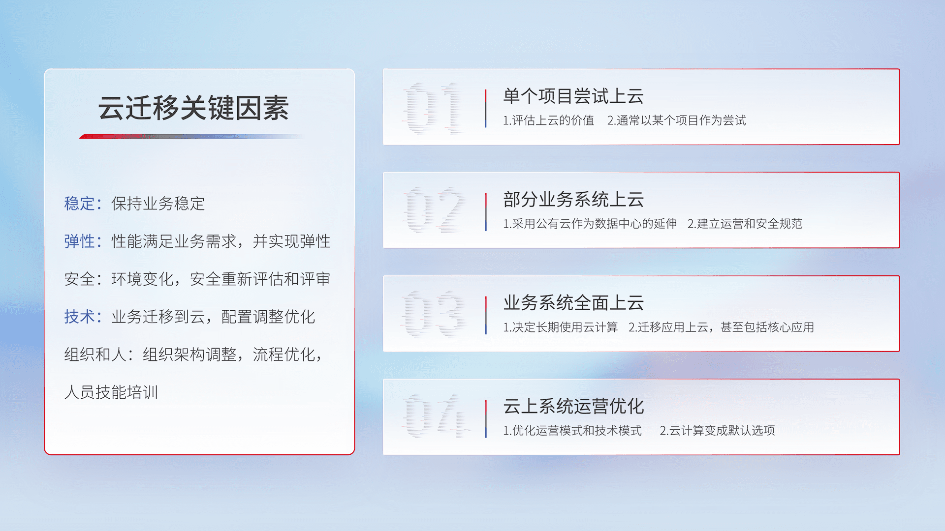 结合实际业务,,从规划设计、、云平台选型、、云原生改造、、、数据迁移、、、、集成交付,,迁移全过程为客户识别最佳上云路径,,,,做好风险识别管理,,,,设计网络架构、、身份权限、、、安全审计合规、、、、操作审计、、日志审计、、、监控告警策略、、、、多站点容灾设计等,,对云上基础设施进行整体规划,,提升IT治理水平,,以满足弹性、、高可用、、高性能的需求。。